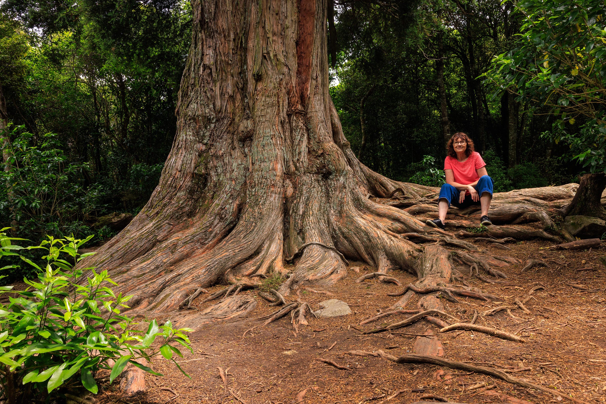 Michèle sitting at the base of a 2000 year old Totara survivor on the Banks Peninsular. If only it could talk. Photography: James Wilkes 2025